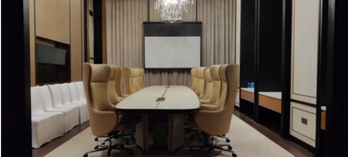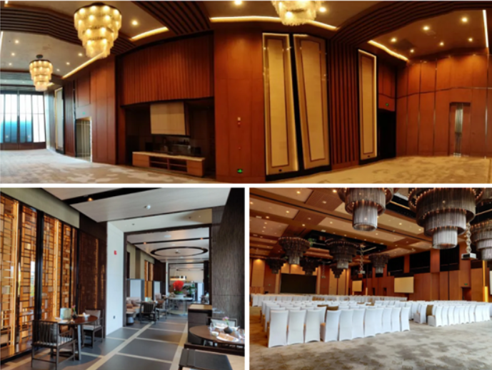 酒店一樓設有大會議室一間、小會議室兩間、董事會議室一間。擴聲采用了EV 6.5寸二分頻吸頂音箱,與Dynacord 數字系列功放,Roland數字調音臺組合的音頻系統,滿足本地會議和遠程會議的使用。會議室的視頻設備均采用了EPSON系列高清工程投影機,高分辨率、低失真、低色差、高透光率等出色的性能,將色彩還原到極致。