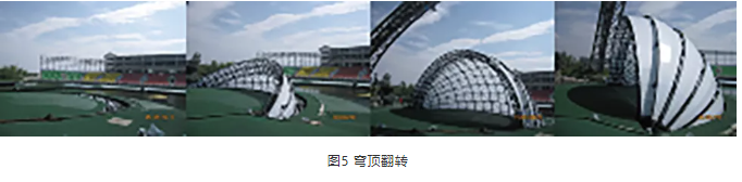 室外表演或?qū)嵕把莩鐾枰蟮奈枧_設(shè)備,提供與演出環(huán)境相適應(yīng)的大型表演舞臺,并根據(jù)演出內(nèi)容進(jìn)行實(shí)時(shí)轉(zhuǎn)換。常規(guī)的平移、升降已無法滿足需求,需要平移、旋轉(zhuǎn)、傾斜、升降等運(yùn)動形式的組合,實(shí)現(xiàn)大型舞臺場景的變化。如云南“希夷之大理”的旋轉(zhuǎn)升降組合穹頂翻轉(zhuǎn)技術(shù)的應(yīng)用。其主舞臺由旋轉(zhuǎn)相切的圓形組成,天棚穹頂是舞臺整體眼睛創(chuàng)意的眼珠,翻轉(zhuǎn)升起后可以作為投影幕使用。其中,五瓣穹頂既要相互分離,還要互相支持依靠,保證輕薄球面結(jié)構(gòu)的整體穩(wěn)定和變形控制,采用主次骨架結(jié)構(gòu)、同軸旋轉(zhuǎn)、液壓頂推、滾動支撐、分離掛鉤等方法,實(shí)現(xiàn)穹頂翻轉(zhuǎn),如圖5所示。采用同心軌道、多點(diǎn)浮動鏈輪驅(qū)動、虛擬圓心定位、電纜滑車供電、液壓系統(tǒng)隨動等方式,實(shí)現(xiàn)大型圓弧轉(zhuǎn)臺的360°旋轉(zhuǎn);采用自主液壓同步控制軟件,有效解決了不同液壓驅(qū)動設(shè)備的同步問題,穩(wěn)態(tài)同步控制精度小于5 mm。