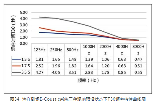 本項(xiàng)目總共進(jìn)行了兩次調(diào)試,第一次調(diào)試完成后,客戶(hù)在使用過(guò)程中感覺(jué)混響時(shí)間不足以滿(mǎn)足廳堂所有的應(yīng)用場(chǎng)景,故又根據(jù)客戶(hù)的需求進(jìn)行了第二次調(diào)試,增長(zhǎng)了混響時(shí)間。除了廳堂自身的固有聲學(xué)條件外,經(jīng)歷了兩次調(diào)試的E-Coustic系統(tǒng)共設(shè)置了10個(gè)混響時(shí)間預(yù)設(shè)模式,分別為1.5 s、1.7 s、1.9 s、2.2 s、2.6 s、2.9 s、3.2 s、3.5 s、4 s和6 s,同時(shí),還設(shè)置了一個(gè)對(duì)廳堂本身聲學(xué)問(wèn)題進(jìn)行一定程度修復(fù)的語(yǔ)音舒適模式。現(xiàn)場(chǎng)調(diào)試完成后選取了1.5 s、1.7 s及3.5 s預(yù)設(shè)進(jìn)行了實(shí)地測(cè)量,T30的測(cè)量結(jié)果如圖34所示。此外,系統(tǒng)本身對(duì)初始時(shí)間間隙、早期反射聲、混響能量等聲學(xué)參數(shù)均可單獨(dú)調(diào)節(jié),這也極大地豐富了系統(tǒng)的綜合調(diào)控能力,使整個(gè)聲學(xué)空間的真實(shí)感和內(nèi)部參數(shù)間的適配度得以有效提升。