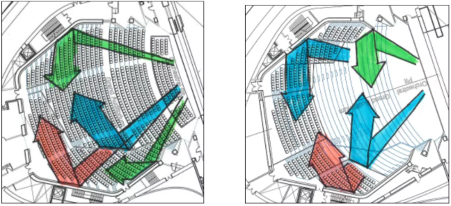 下圖是歌劇廳的一階反射聲,即聲音從舞臺(tái)擴(kuò)聲器發(fā)出后經(jīng)過第一次反射的路徑分析。從各個(gè)箭頭的指向與長(zhǎng)度可以看出,聲音到達(dá)各區(qū)域座位距離、時(shí)間相當(dāng),也就是各區(qū)域觀眾都能有相似的聽覺體驗(yàn)。