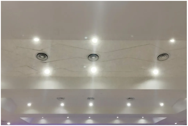 考慮到高層觀眾離天花更近,回音影響更大,在騎樓、高層處的天花與墻面需要更強(qiáng)的吸音效果。設(shè)計(jì)師巧妙地將空調(diào)回風(fēng)口與燈架一起設(shè)置在天花板與兩側(cè)上方,既完成了座椅下送風(fēng)、頂棚回風(fēng)的節(jié)能空氣處理系統(tǒng),又通過凹凸不平的墻面削弱了回聲。