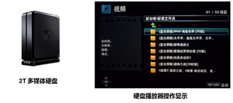 您也可以選擇播放外掛的2T多媒體硬盤上的內容。2000G的海量存儲空間,可存儲成百乃至上千部的海量電影、電視劇、音樂CD等等,內容可以自由拷貝、隨時更新。可以滿足家人所有要求,有孩子動畫片、年輕人喜歡的好萊塢大片、妻子喜歡的愛情片和連續劇、父母喜歡的戲曲或經典老片等等。