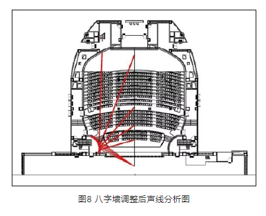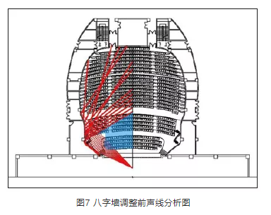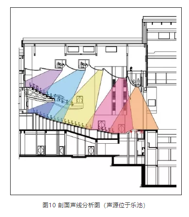 觀眾廳剖面設(shè)計(jì)取決于兩個(gè)因素。一是規(guī)范規(guī)定的每座容積,它能確定觀眾廳吊頂?shù)拇蟾鸥叨龋欢怯^眾廳剖面聲線分析,它能確定吊頂?shù)淖罱K形式。結(jié)合上述兩個(gè)因素,最終確定的吊頂形式如圖9、圖10所示。可以看出,經(jīng)吊頂反射的聲音能覆蓋觀眾席的所有區(qū)域,其分布均勻,能達(dá)到良好的聲場(chǎng)效果。
