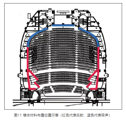 根據(jù)確定的混響時(shí)間值,對(duì)主劇場(chǎng)觀眾廳進(jìn)行聲學(xué)材料布置,同時(shí)遵循室內(nèi)聲學(xué)材料布置原則,確定觀眾廳空間以下部位的材料及構(gòu)造做法。