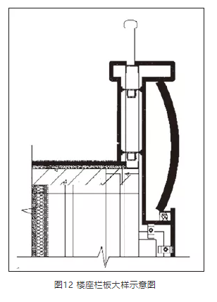 樓座欄板應(yīng)避免垂直面,做吸聲或擴(kuò)散處理。根據(jù)觀眾廳混響時(shí)間控制,以及結(jié)合內(nèi)裝裝飾效果,在欄板部分做弧形擴(kuò)散處理,大樣示意見(jiàn)圖12。
