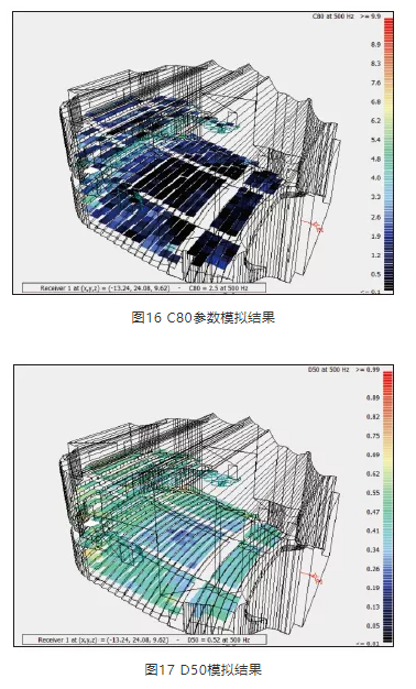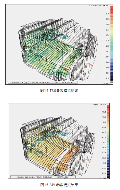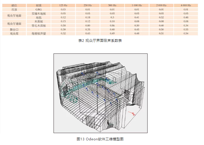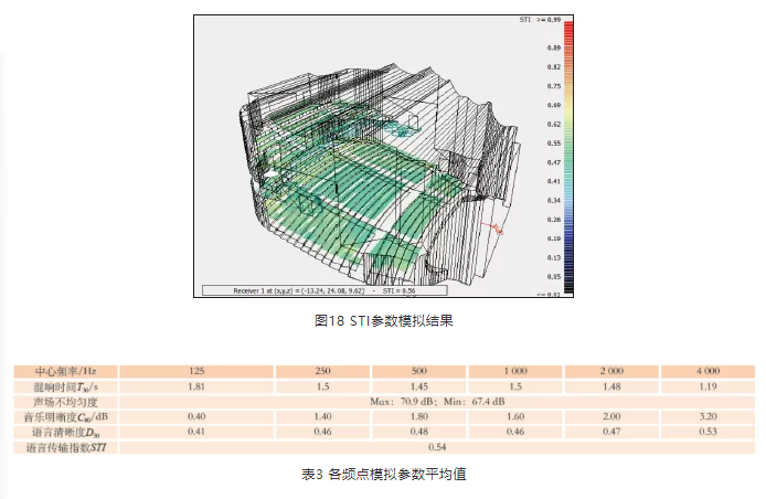 混響時(shí)間設(shè)計(jì)完成后, 采用Odeon軟件對(duì)聲場(chǎng)環(huán)境進(jìn)行模擬,對(duì)方案起到一定的校正作用。觀眾廳各部位吸聲系數(shù)見(jiàn)表2,圖13為模擬軟件中三維模型圖,圖14~圖18為各參數(shù)的模擬結(jié)果,表3為各測(cè)點(diǎn)平均值。