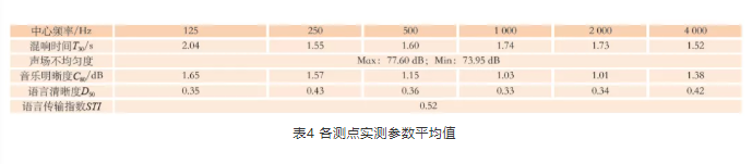 語(yǔ)言清晰度是評(píng)價(jià)廳堂語(yǔ)言聲是否清晰的參數(shù),所有倍頻程測(cè)量結(jié)果均大于0.3,略小于要求的≥0.45,可能是由于空?qǐng)霏h(huán)境缺少觀眾吸聲造成的。