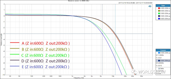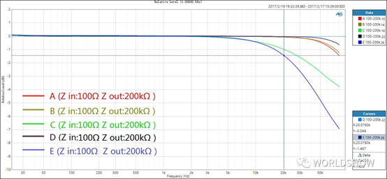 圖中可以看到,輸出阻抗為600Ω時,所有五款線材在音頻范圍內(nèi)都有明顯的衰減,傳輸線路的幅頻響應(yīng)看上去像是專門設(shè)計的低通濾波器了。表現(xiàn)最好的是D號線,其截止頻率為11.3 kHz,最差的是E號線,截止頻率在5.4 kHz。這樣的高頻衰減,在實際的系統(tǒng)中當(dāng)然是決不允許的。好在這種情況在高品質(zhì)的專業(yè)級音頻設(shè)備中通常不會發(fā)生,這些設(shè)備通常有設(shè)計合理的輸出阻抗。