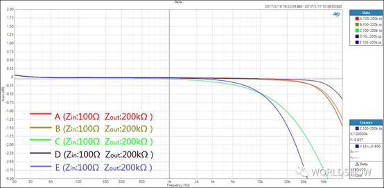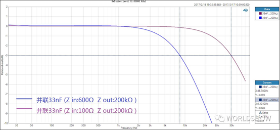 可以看到,-3 dB衰減頻率為8.25 kHz,而在20 kHz的衰減達(dá)到-8.28 dB!這樣的衰減會丟失重要的高頻成分,使聲音完全失去色彩,是絕不可接受的。可是為什么會這樣?我們回到公式中計算一下,當(dāng)輸出阻抗由100Ω調(diào)整到600Ω,電路總電阻為: