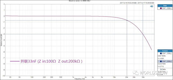 通過頻率響應(yīng)圖我們可以看出實際的-3dB衰減頻率為48.9 kHz,與上式的計算結(jié)果48.28 kHz基本符合。同時我們看到在通常所說的音頻上限頻率20 kHz處,衰減約為-0.7dB。絕大多數(shù)時候,這種高頻的衰減可以接受,然而靈敏的音響師耳朵可能會對這樣的衰減有所察覺。