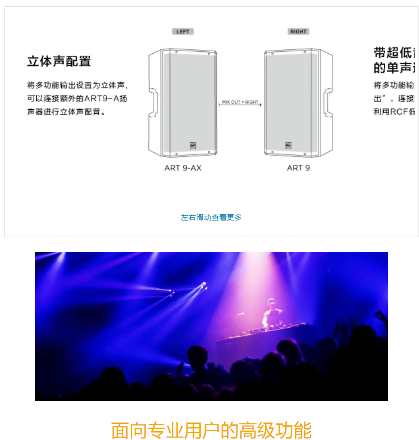 RCF最新推出了全新的ART9-AX系列,ART9-AX是一款具有48V麥克風前置放大器和線路輸入、內置6通道數字調音臺和高級DSP、Bluetooth®(藍牙)流媒體和控制功能的兩分頻揚聲器。適用于任何音頻應用的頂級解決方案。