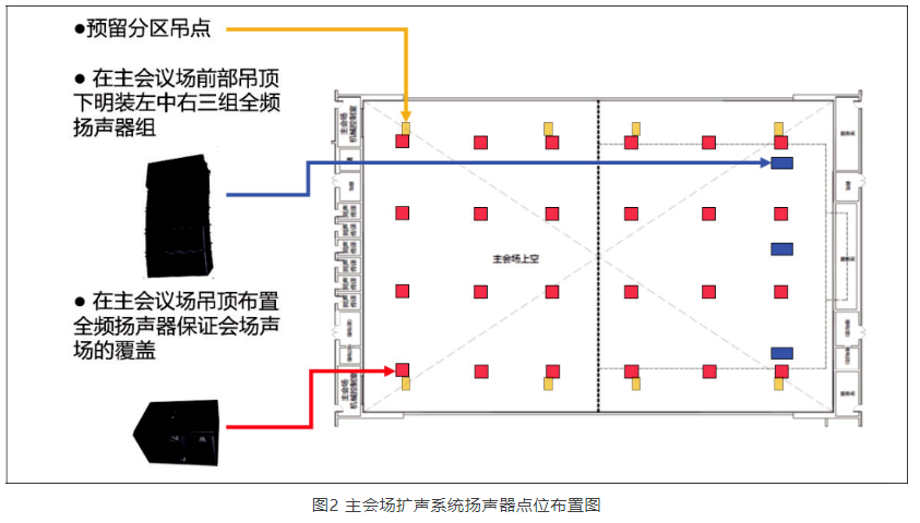 在大會(huì)模式下,主揚(yáng)聲器系統(tǒng)采用左中右三聲道方式,由24只線陣列全頻揚(yáng)聲器和4只次低頻揚(yáng)聲器組成,分別通過電動(dòng)葫蘆吊掛于主席臺(tái)前沿頂部。主揚(yáng)聲器系統(tǒng)吊點(diǎn)位置參照主席臺(tái)區(qū)域布置,并錯(cuò)開主通道區(qū)域上方空間。同時(shí),在會(huì)場(chǎng)吊頂內(nèi)暗裝24只大功率全頻揚(yáng)聲器分散均勻覆蓋全場(chǎng),可與主揚(yáng)聲器系統(tǒng)互為補(bǔ)充,如圖2所示。