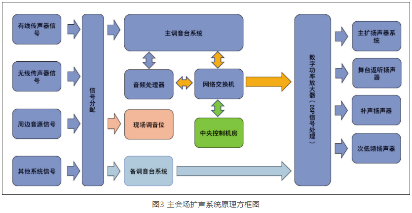擴(kuò)聲系統(tǒng)架構(gòu)如圖3所示。本地傳聲器輸入信號(hào)可通過無源傳聲器分配器,分別送至數(shù)字調(diào)音臺(tái)、模擬調(diào)音臺(tái)以及現(xiàn)場(chǎng)調(diào)音位。數(shù)字調(diào)音臺(tái)信號(hào)既可通過網(wǎng)絡(luò)音頻方式(DANTE協(xié)議),也可通過獨(dú)立數(shù)字音頻處理器組送至數(shù)字功率放大器;模擬調(diào)音臺(tái)信號(hào)直接接入數(shù)字功率放大器,通過功率放大器內(nèi)置DSP對(duì)輸入信號(hào)進(jìn)行主備信號(hào)倒換。