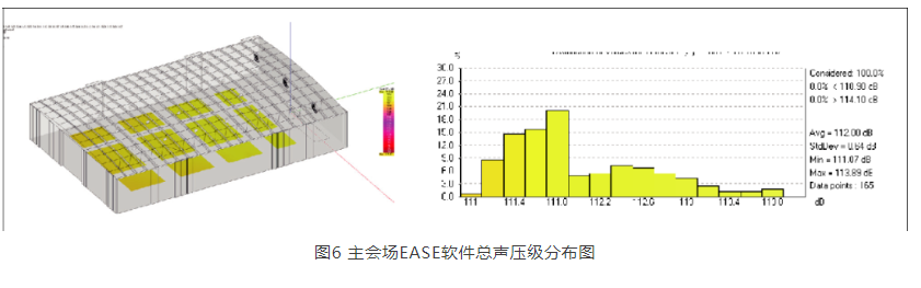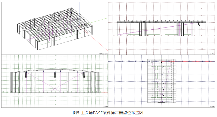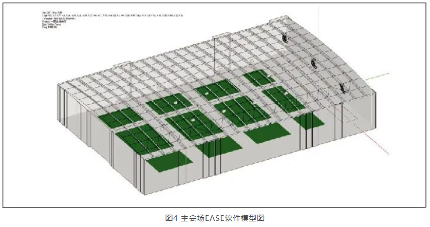 為驗(yàn)證擴(kuò)聲系統(tǒng)可行性,筆者對(duì)主會(huì)場(chǎng)做了EASE聲場(chǎng)模擬,如圖4、圖5、圖6所示,滿足設(shè)計(jì)目標(biāo)。