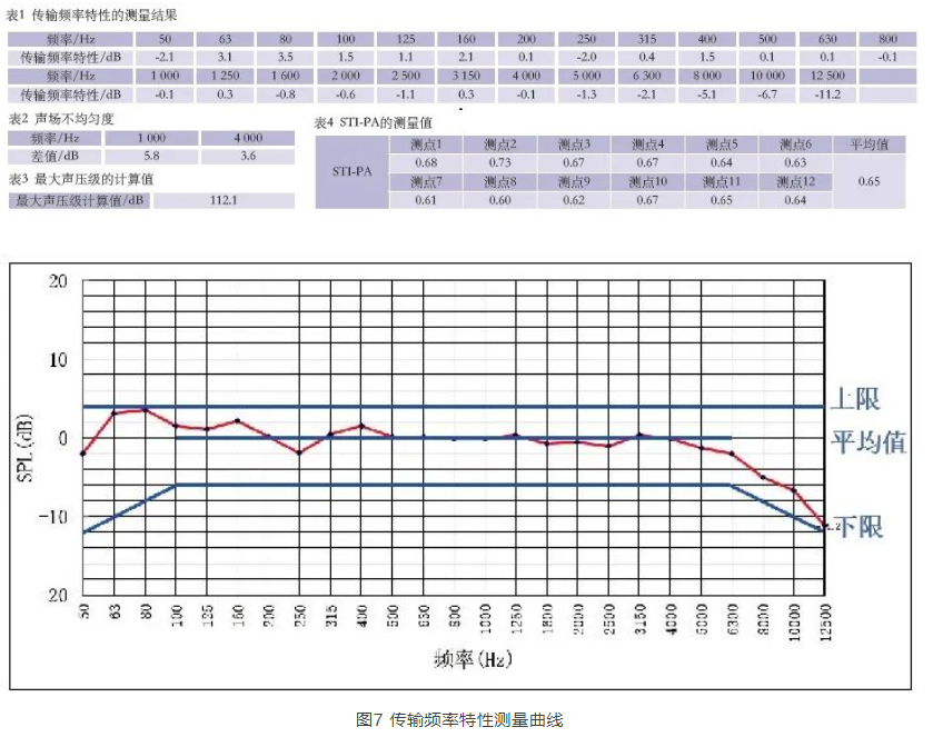 擴(kuò)聲系統(tǒng)安裝調(diào)試完畢后,筆者對(duì)主會(huì)場(chǎng)進(jìn)行了擴(kuò)聲系統(tǒng)指標(biāo)現(xiàn)場(chǎng)測(cè)試。由于主席臺(tái)區(qū)域會(huì)議發(fā)言位置未確定,此次測(cè)量并未包含傳聲增益指標(biāo),測(cè)量結(jié)果見表1至表4、圖7。擴(kuò)聲系統(tǒng)各項(xiàng)指標(biāo)均達(dá)到設(shè)計(jì)目標(biāo)及行業(yè)相關(guān)標(biāo)準(zhǔn)指標(biāo)。