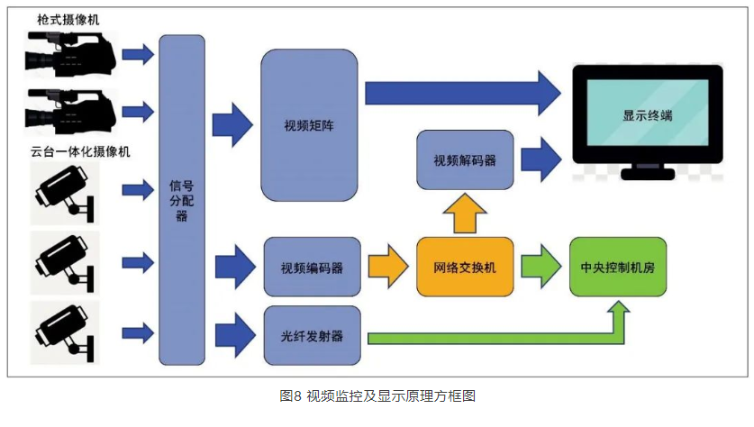 視頻監(jiān)控系統(tǒng)框架如圖8所示,視頻采集信號(hào)通過本地H D M I分配器,一路送至音視頻控制室視頻矩陣,另一路送至分布式視頻信號(hào)接收器,接入會(huì)議中心分布式視頻網(wǎng)絡(luò)。送至音視頻控制室的視頻信號(hào),送至本地控制室監(jiān)視器、同傳間監(jiān)視器、舞臺(tái)機(jī)械控制室監(jiān)視器、本地會(huì)場(chǎng)墻面綜合插座箱等。送至分布式視頻信號(hào)接收機(jī)的視頻信號(hào),通過會(huì)議中心音視頻網(wǎng)絡(luò)送至中央控制機(jī)房,并保留本地視頻信號(hào)光纖鏈路,可通過光收發(fā)設(shè)備直傳至中央控制機(jī)房。